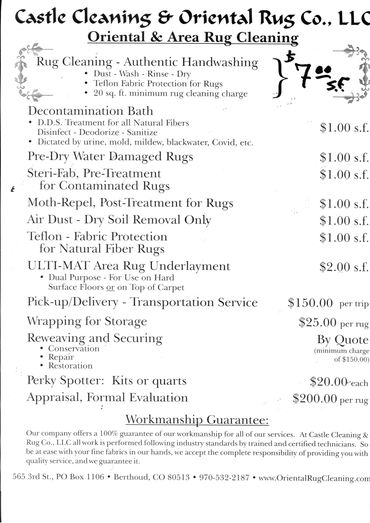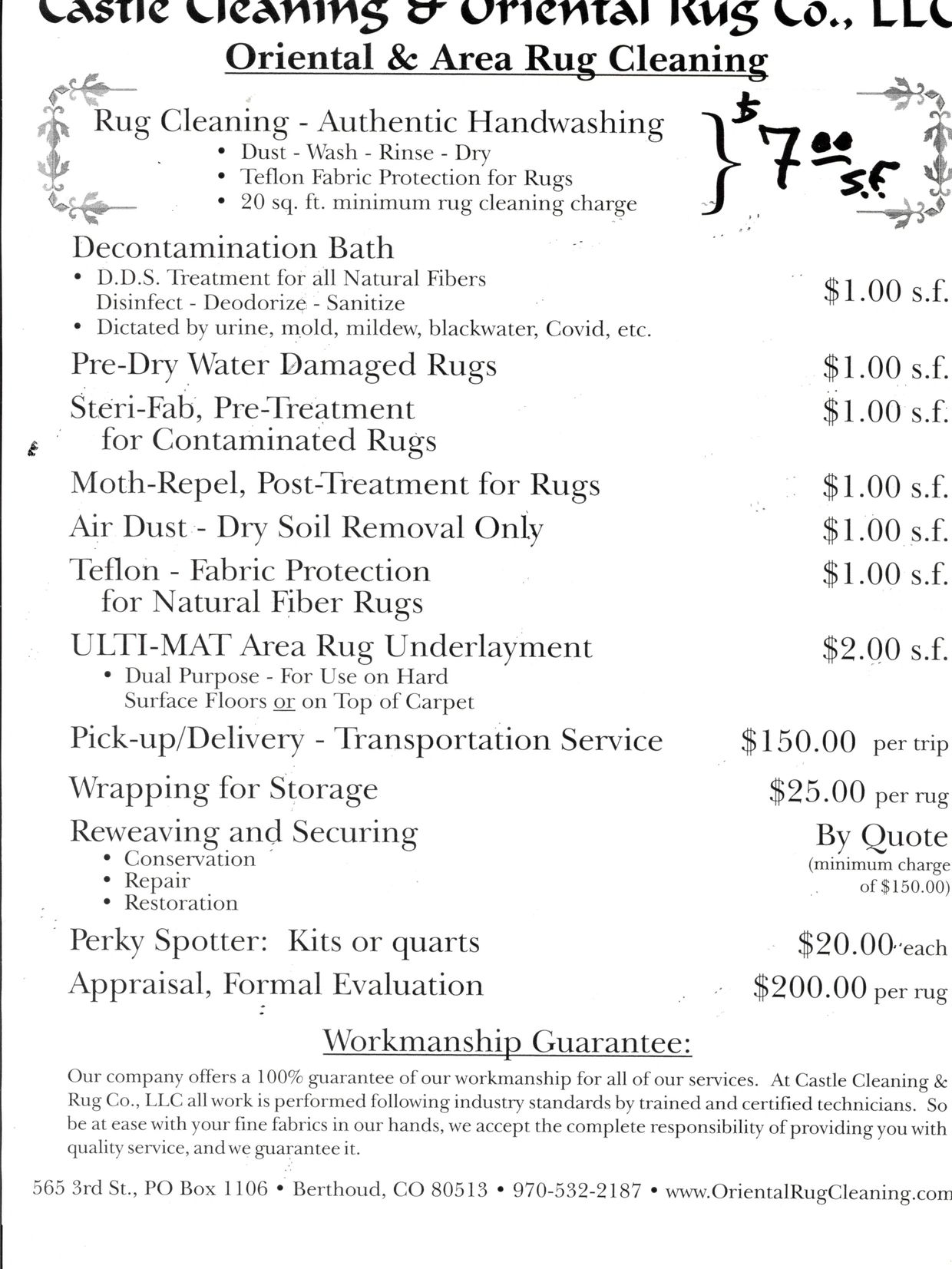 At Castle Cleaning & Oriental Rug Company, all work is performed following industry standards by trained and certified technicians. Our company offers a 100% guarantee of our workmanship for all of our services.